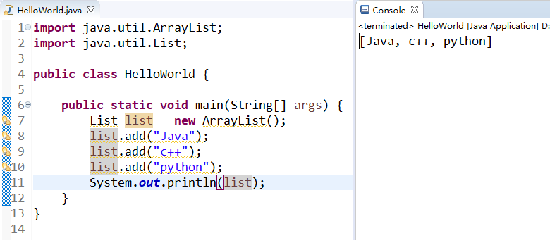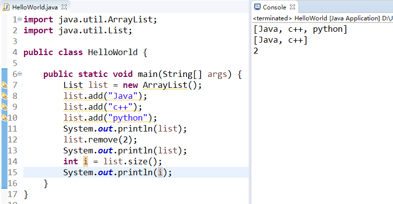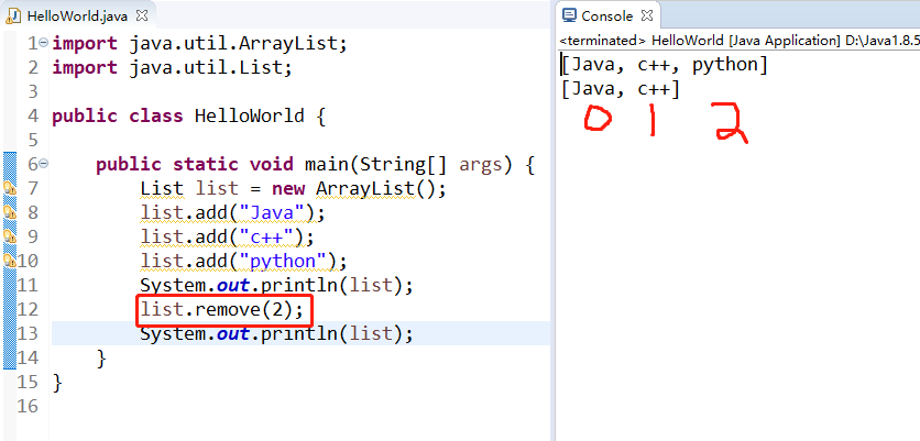 然后调用remove方法,去掉第二个,然后输出,我们发现python没有了,这个呢和数组是一样的,第一个Java是0,c++是1。
