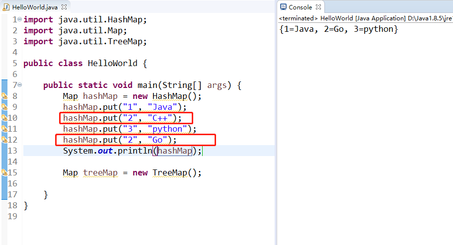 其实,是被覆盖掉了,所以,在一个Map集合中,不可能出现两个key相同的值,如果强行插入一个key相同的,那么,上一个就会被覆盖掉的。