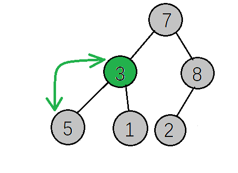 下一步,继续找到下一个非叶子节点(其实就是当前坐标-1就行了),该节点的值为3小于其左子树的值,交换值,交换后该节点值为5,大于其右子树的值,不需要交换