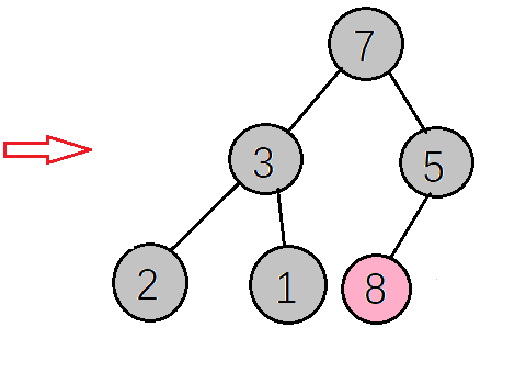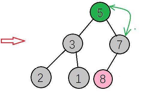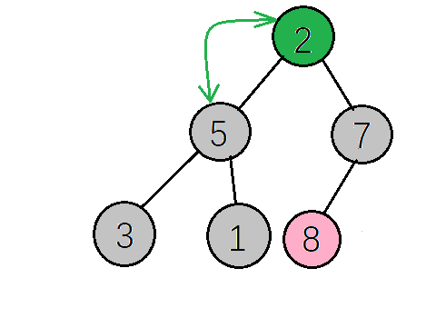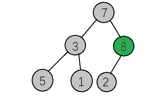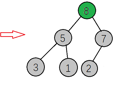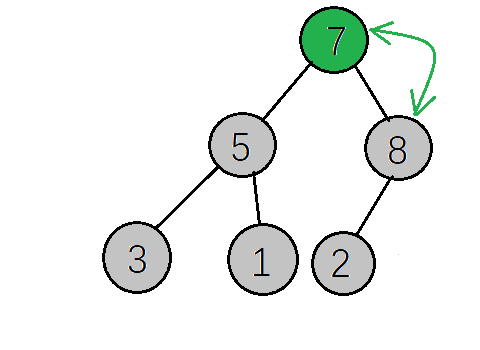 下一步,检查调整后的子树,是否满足大顶堆性质,如果不满足则继续调整(这里因为只将右子树的值与根节点互换,只需要检查右子树是否满足,而8>2刚好满足大顶堆的性质,就不需要调整了,