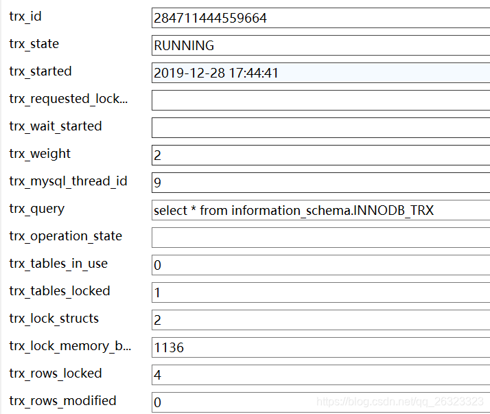 284711444560536 RUNNING 2019-12-28 18:01:38 2 10 select * from information_schema.INNODB_TRX 0 1 2 1136 4 0 0 REPEATABLE READ 1 1 0 0 0 0