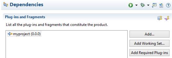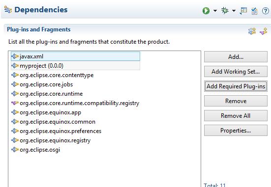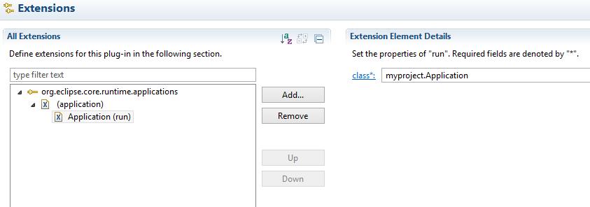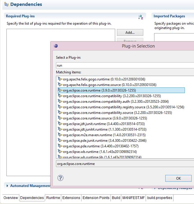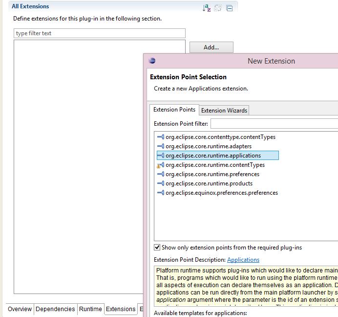 Now I am creating an application. Application is an extension to org.eclipse.core.runtime.applications extension point, which is implemented inside org.eclipse.core.runtime plug-in. So I add this plug-in as a dependency: