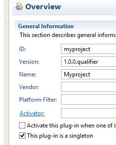 Simultaneously MANIFEST.MF becomes invalid, since it is now required to be singleton, which is set either automatically, or by check box from Overview tab:
