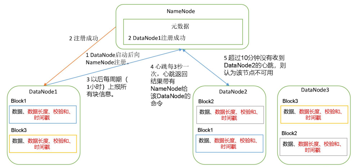 - 心跳是每 3 秒一次,心跳返回结果带有 NameNode 给该 DataNode 的命令如复制块数据到另一台机器,或删除某个数据块。如果超过 10 分钟没有收到某个 DataNode 的心跳,则认为该节点不可用。
