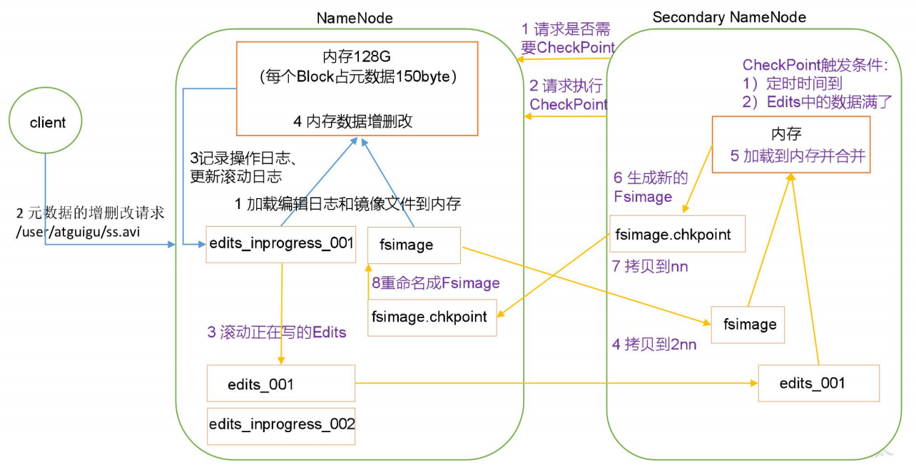 - 生成新的镜像文件fsimage.chkpoint。拷贝fsimage.chkpoint到NameNode。