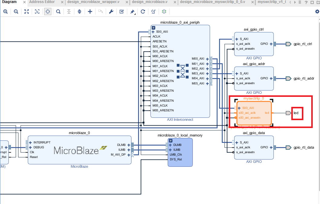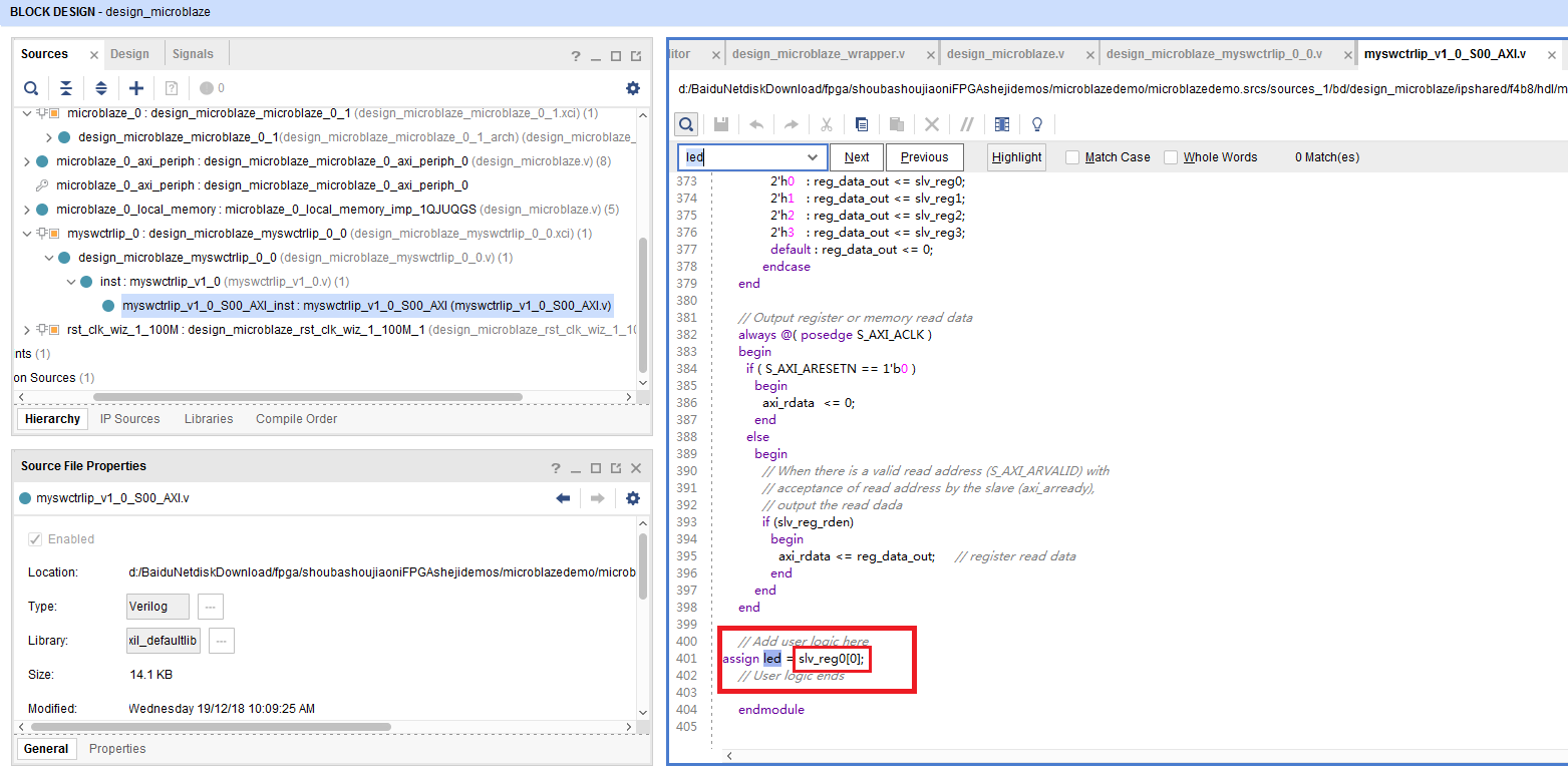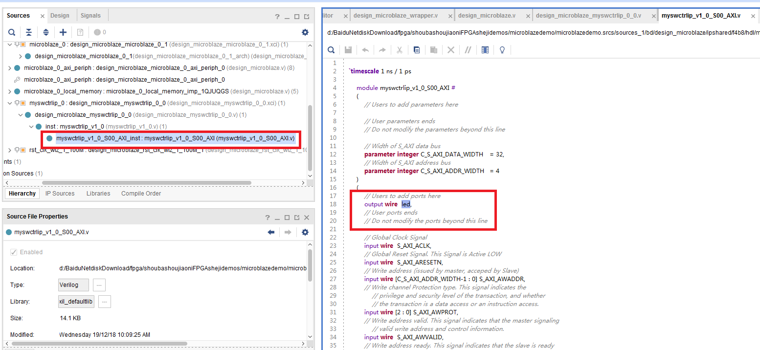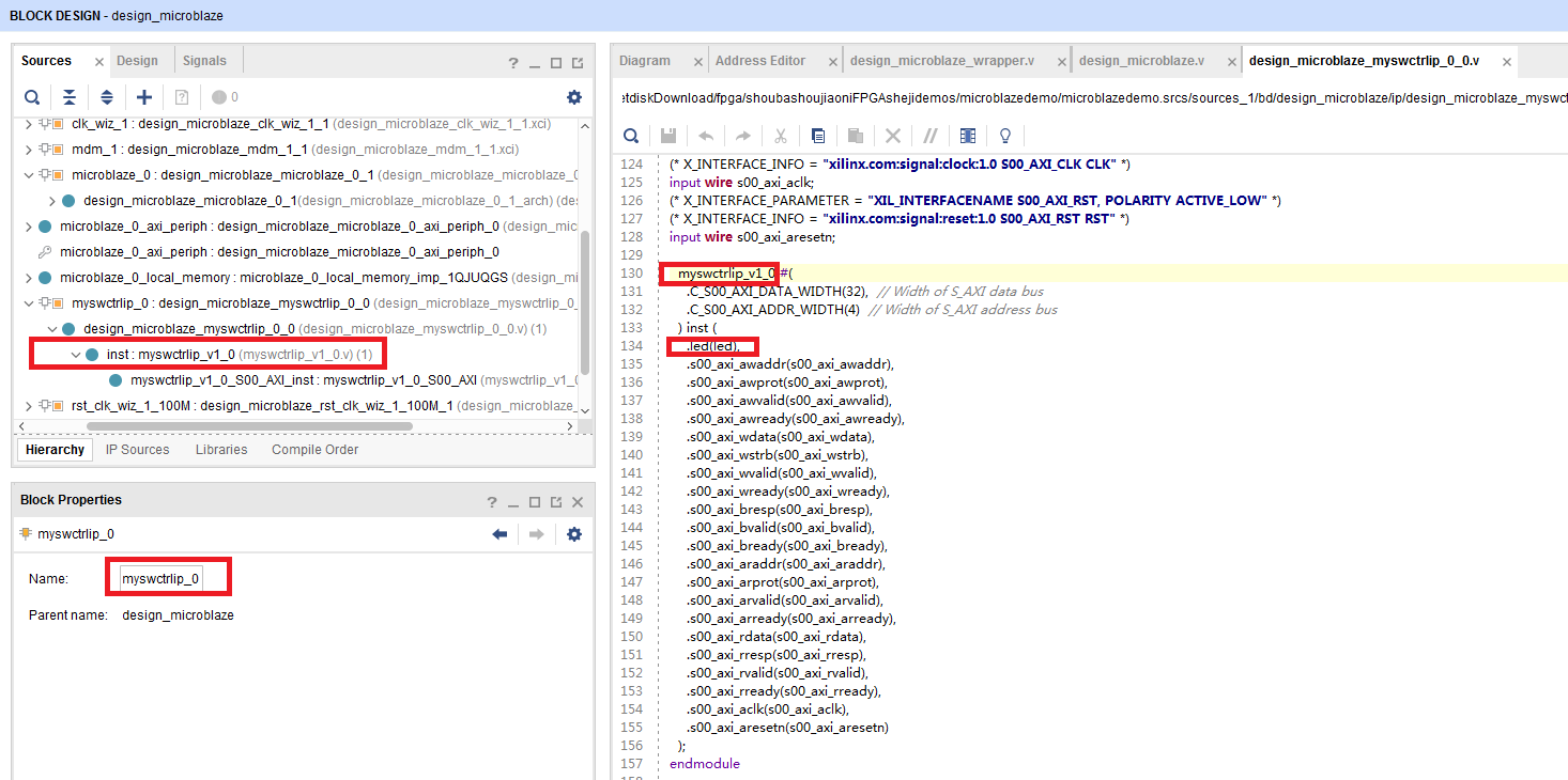 3:因为myswctrlip_v1_0_S00_AXI.v中增加了我的逻辑led部分,所以在caller中实例化时要增加led