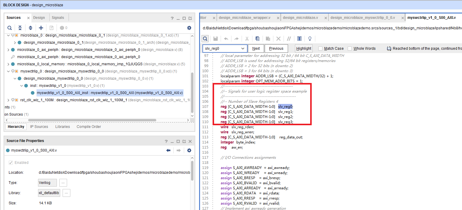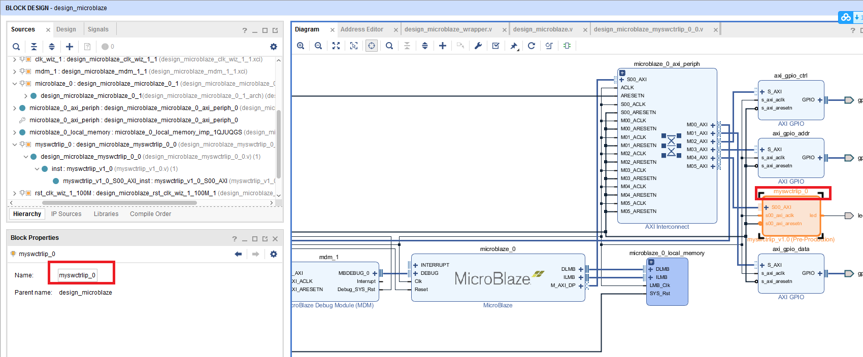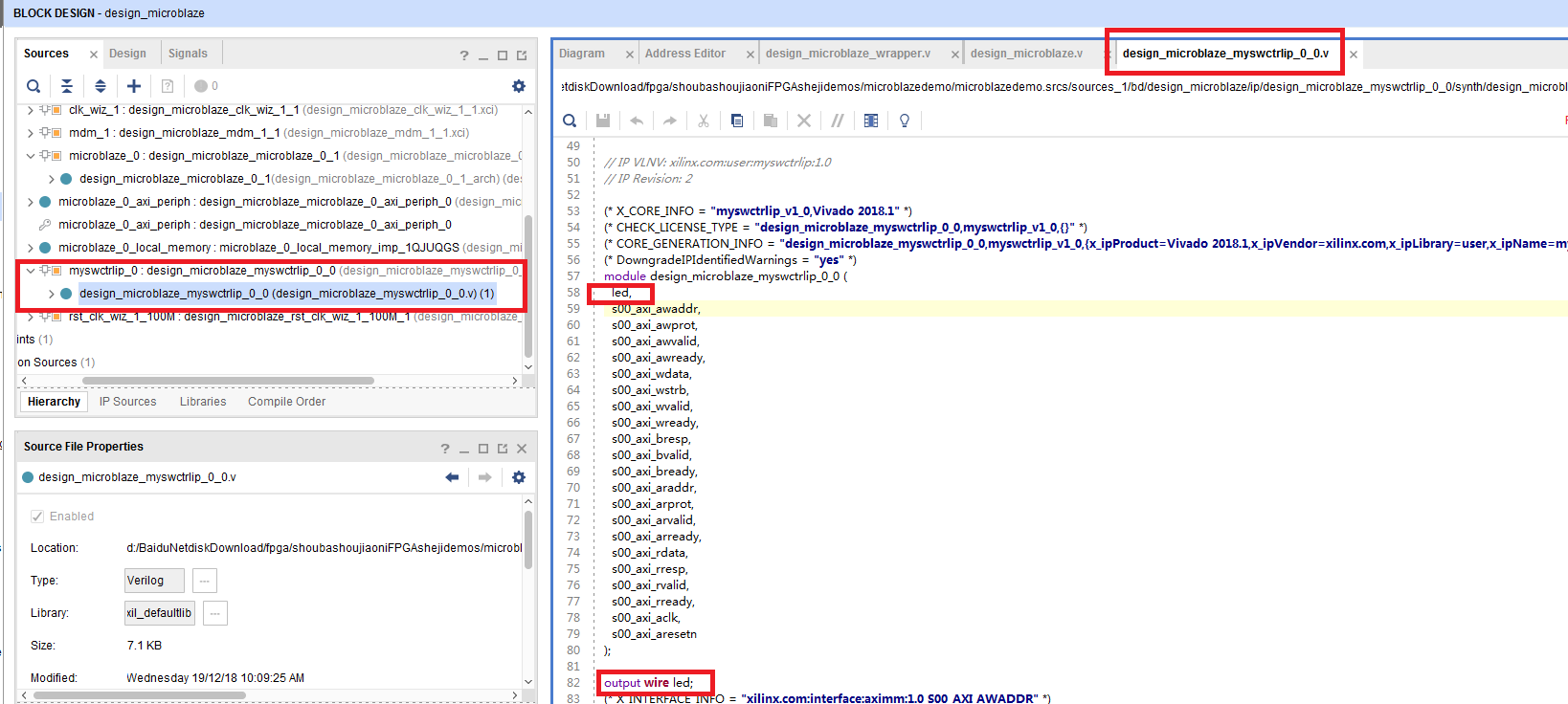3:因为myswctrlip_v1_0_S00_AXI.v中增加了我的逻辑led部分,所以在caller中实例化时要增加led