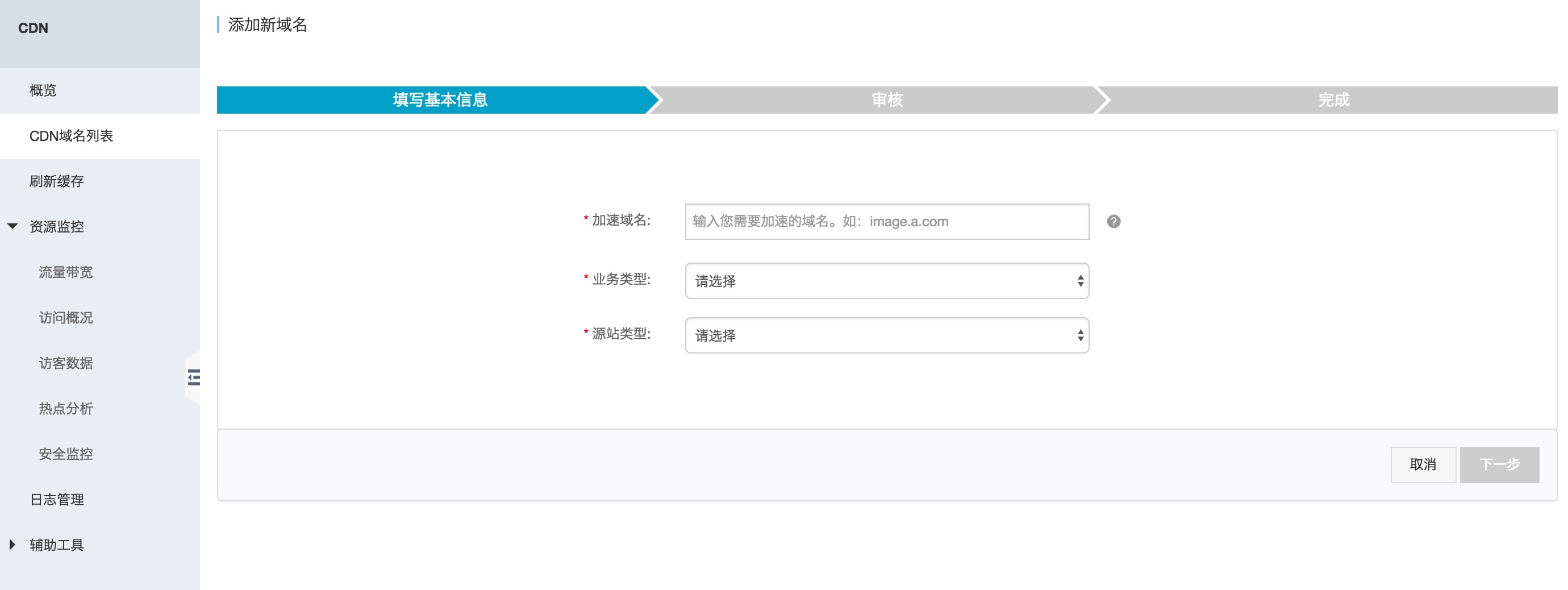在阿里云 CDN 控制界面开通服务,添加一个加速域名(加速域名不能与源站域名相同,不然无法生效)
