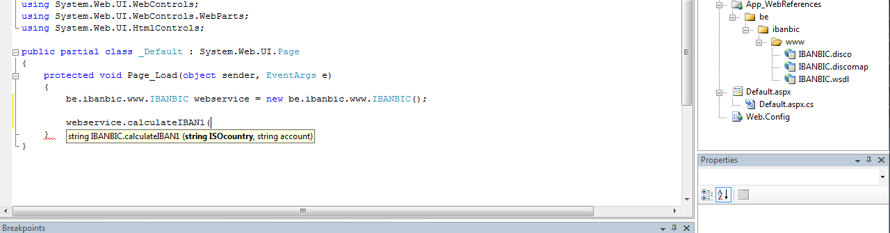 I have read a lot of forums and tutorials, but all the information is about setting up a webservice in ASP.net or using ajax / javascript. I just need to call the function: calculateIBAN1.