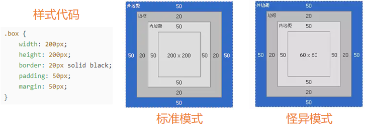 怪异模式:盒子总宽度/高度 = width/height + margin。