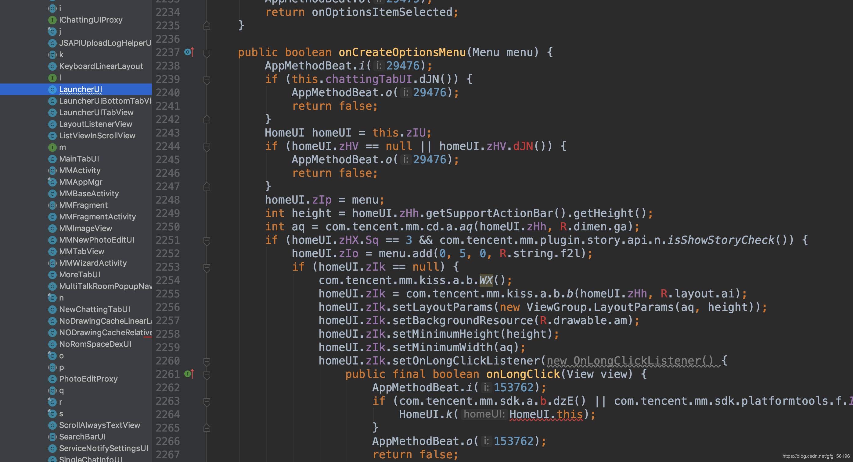 我们先找到 com.tencent.mm.ui.LauncherUI 类里的 onCreateOptionsMenu 方法。