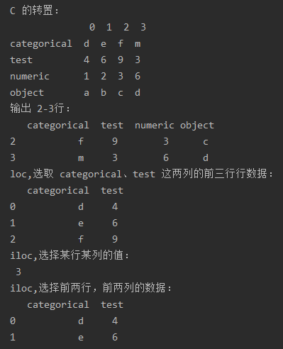 print('loc,选取 categorical、test 这两列的前三行行数据: \n', c.loc[:2, ('categorical', 'test')])
