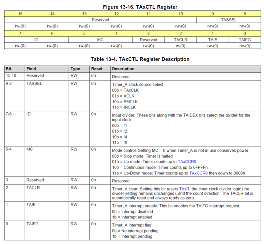 - TAIFG : Timer_A中断标志位,即使中断不使能,当产生中断信号时,标志位也会置位。