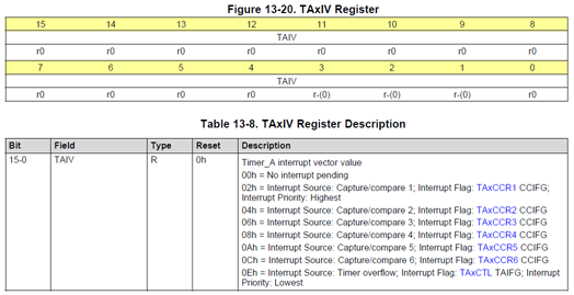 - TAIV : 只读寄存器,中断类型标志位,用来识别是哪个中断源引起的中断(因为除了TAxCCR0,其他中断源共享一个中断向量)