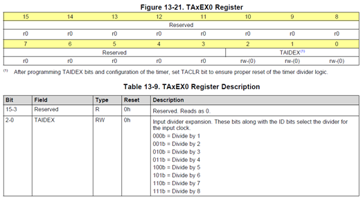 - TAxIDEX : 输入时钟分频寄存器,和TAxCTL寄存器中ID位效果一致,用来对所选的时钟进行分频后再输入给Timer_A。