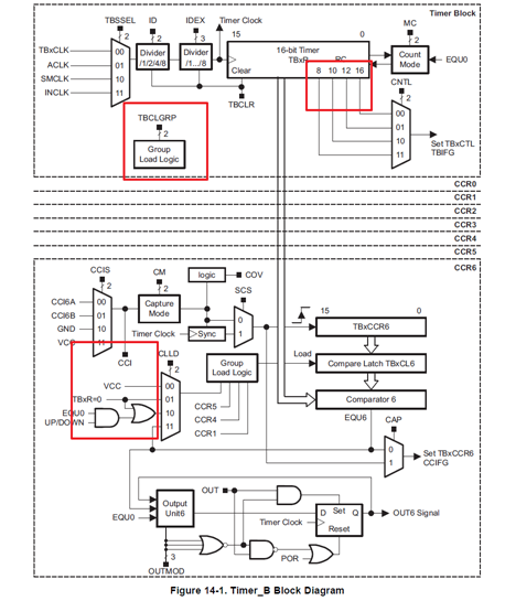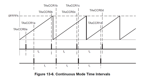 - 当设定CCR0值时,TAxR值小于CCR0的值,那么定时器从当前值(TAxR)开始计数,不影响TAxR的值。