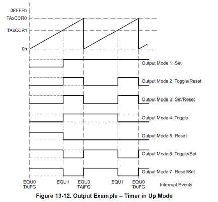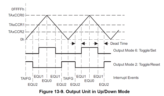 上图显示的是在Up/down模式下CCRx使用方式,当然 这个也是PWM的输出方法,由CCR0通道作为base计数,用于调节PWM的频率,CCRx则用来调节占空比,而且还支持多种输出模式。这个模式的区别,后面会详细讲解。