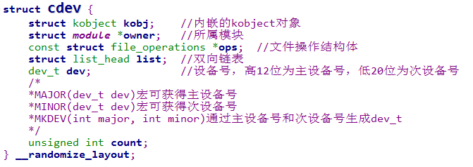 在Linux内核中,使用结构体cdev对字符设备进行描述,其定义如下图所示: