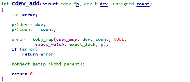 cdev_add()函数用于向系统添加一个cdev,完成字符设备的注册,函数的代码如下所示: