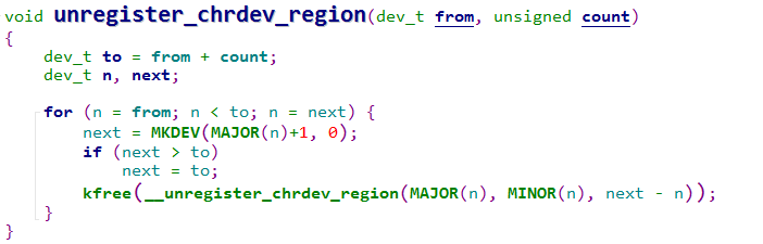 该函数用于释放掉原先申请的设备号,函数的原型如下所示: