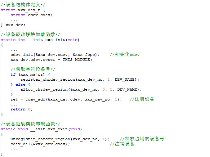 在字符设备驱动模块的加载函数中要实现设备号的申请和cdev的注册,然而在字符设备驱动模块的卸载函数中,要实现cdev的注销以及设备号的释放,常见的设备结构体,模块加载和模块卸载函数如下图所示: