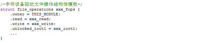 在字符设备驱动中,需要定义一个file_operations的实例,并将具体的设备驱动函数赋值给file_operations的成员,如下所示: