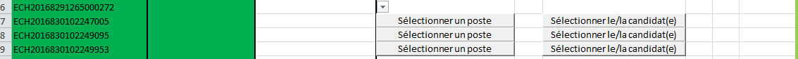 I'm a newbie in VBA I am trying to make a button in Excel but I am stumped on how to figure out the row of the clicked button. Like in the photo I want that when I click the button "Sélectionner un poste" then he will tell me his position (The button which i clicked in which row)