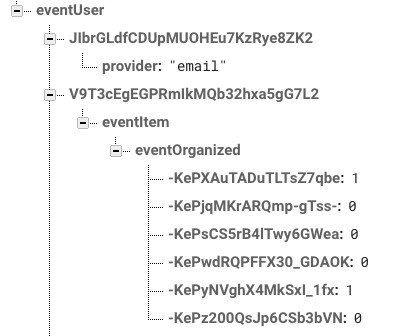If you want all the eventOrganized nodes with a value of 1 under that key then you need to use the following query.