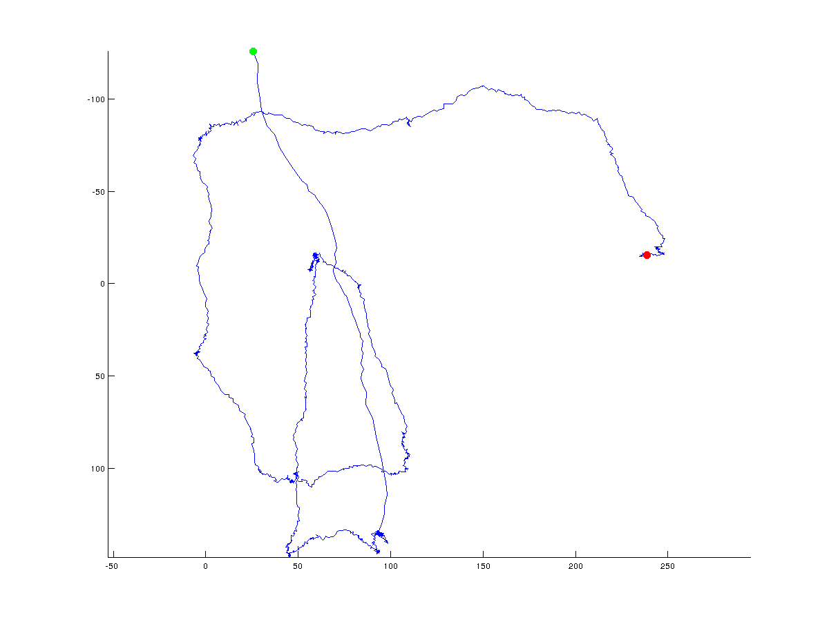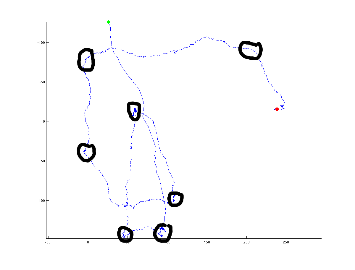 I'm trying to come up with an algorithm that will determine turning points in a trajectory of x/y coordinates. The following figures illustrates what I mean: green indicates the starting point and red the final point of the trajectory (the entire trajectory consists of ~ 1500 points):