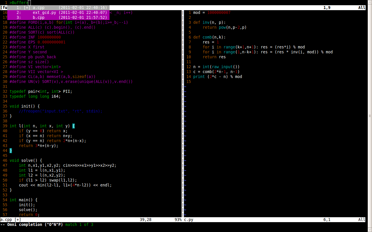 Consider the below screenshot: in order to switch to ext_gcd.py I just need to press,bg : ,b invokes buffers list and g fuzzy-matches the only buffer