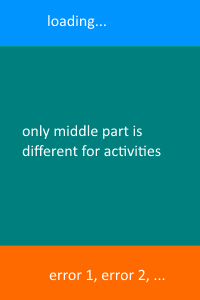 Is there any possible way to share layout(part) between activities? For example, in my app, all activities have similar layout, the top part is long operation indicator (a progress bar, hidden when no operation is being executed), the bottom part is for showing errors. Only the middle part is different for all activities. See the picture below.