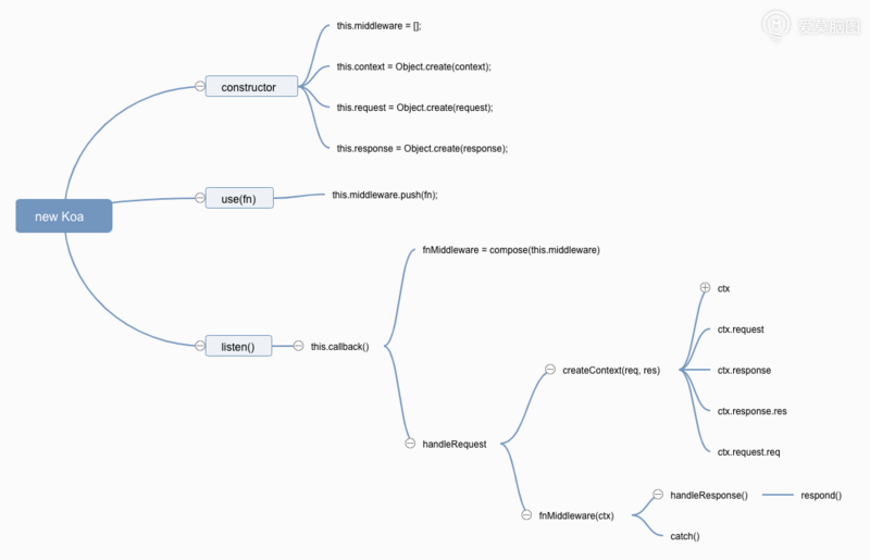 new初始化一个实例,use搜集中间件到middleware数组,listen 合成中间件fnMiddleware,返回一个callback函数给http.createServer,开启服务器,等待http请求。