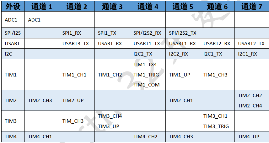例如通道1,三个外设采用逻辑或到通道一,所以在同一时间,我们只能使用其中的一个外设。