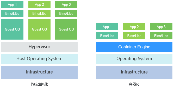 传统虚拟机技术是虚拟出一套硬件后,在其上运行一个完整操作系统,在该系统上再运行所需应用进程;而容器内的应用进程直接运行于宿主的内核,容器内没有自己的内核,而且也没有进行硬件虚拟。因此使得Docker技术比虚拟机技术更为轻便、快捷。