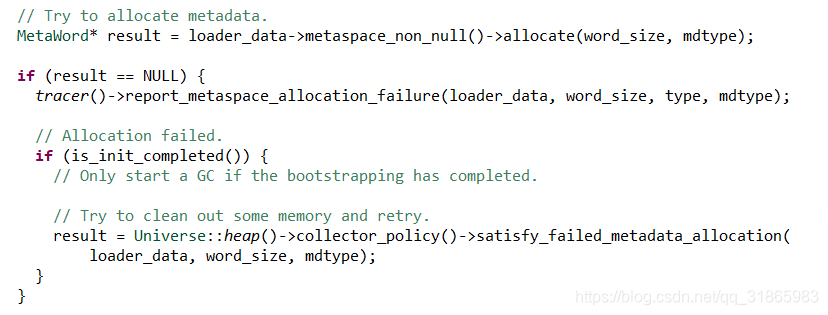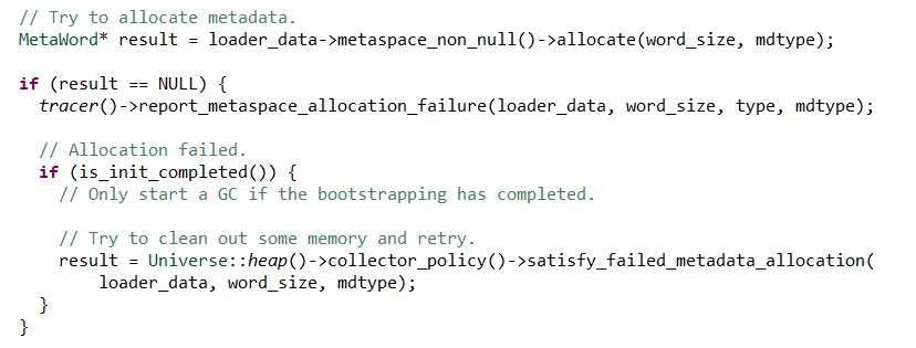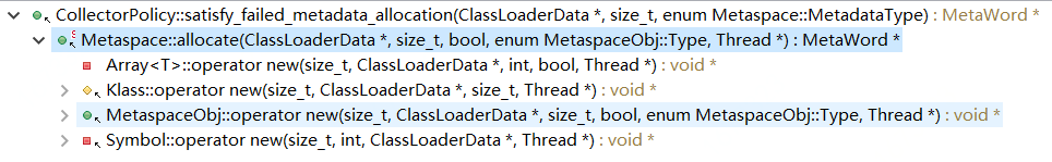 satisfy_failed_metadata_allocation是当Metaspace分配内存失败后调用的,用来清理Metaspace空间并尝试重新分配的,该方法的调用链如下: