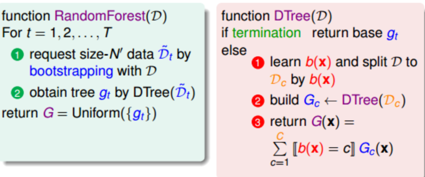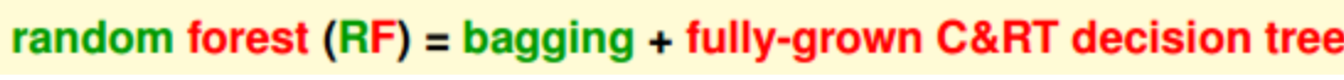 所以说,Bagging能减小variance,而Decision Tree能增大variance。如果把两者结合起来,能否发挥各自的优势,起到优势互补的作用呢?这就是我们接下来将要讨论的 aggregation of aggregation,即使用Bagging的方式把众多的Decision Tree进行 uniform结合起来。这种算法就叫做随机森林(Random Forest),它将完全长成的 C&RT决策树通过bagging的形式结合起来,最终得到一个庞大的决策模型。