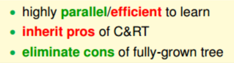 Random Forest算法的优点主要有三个。第一,不同决策树可以由不同主机并行训练生成,效率很高;第二,随机森林算法继承了C&RT的优点;第三,将所有的决策树通过bagging的形式结合起来,避免了单个决策树造成过拟合的问题。