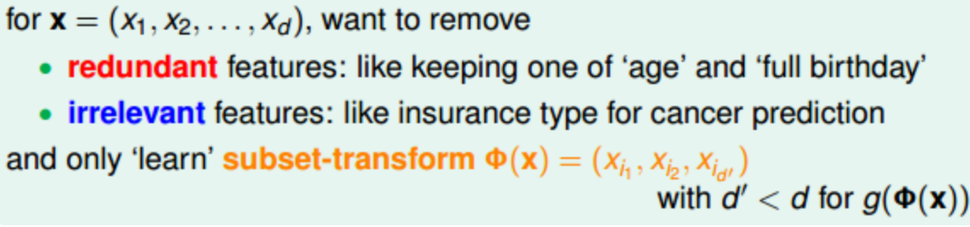 如果样本数据特征过多,假如有10000个特征,而我们只想从中选取300个特征,这时候就需要舍弃部分特征。通常来说,需要移除的特征分为两类:一类是冗余特征,即 特征出现重复,例如“年龄”和“生日”;另一类是不相关特征,例如疾病预测的时候引入的“保险状况”。这种从d维特征到d'维特征的subset-transform