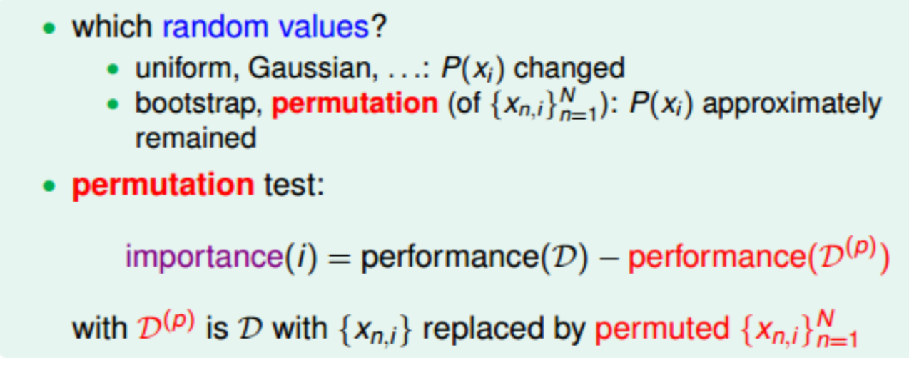 那么random test中的随机值如何选择呢?通常有两种方法:一是使用uniform或者 gaussian抽取随机值替换原特征;一是通过permutation的方式将原来的所有N个样本的第i个特征值重新打乱分布(相当于重新洗牌)。比较而言,第二种方法更加科学, 保证了特征替代值与原特征的分布是近似的(只是重新洗牌而已)。这种方法叫做 permutation test(随机排序测试),即在计算第i个特征的重要性的时候,将N个样本的第i个特征(第i列)重新洗牌,然后比较D和
