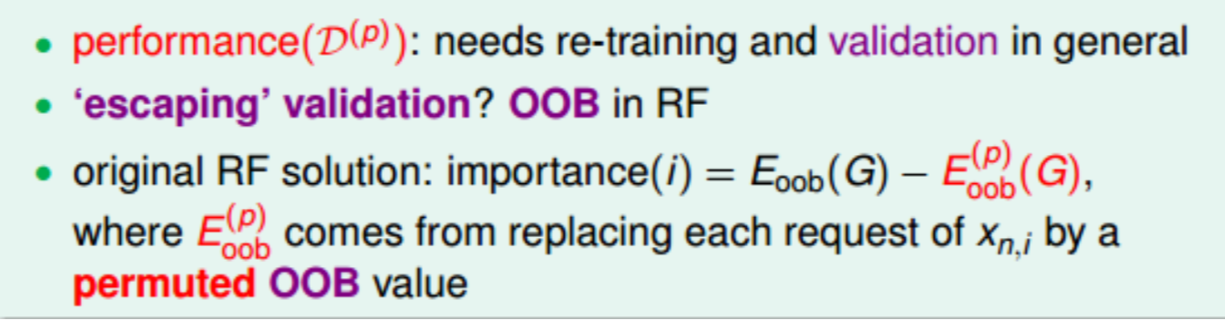 。也就是说, 在训练的时候仍然使用D,但是在OOB验证的时候,将所有的OOB样本的第i个特征重新洗牌,验证G的表现。这种做法大大简化了计算复杂度,在RF的feature selection中 应用广泛。