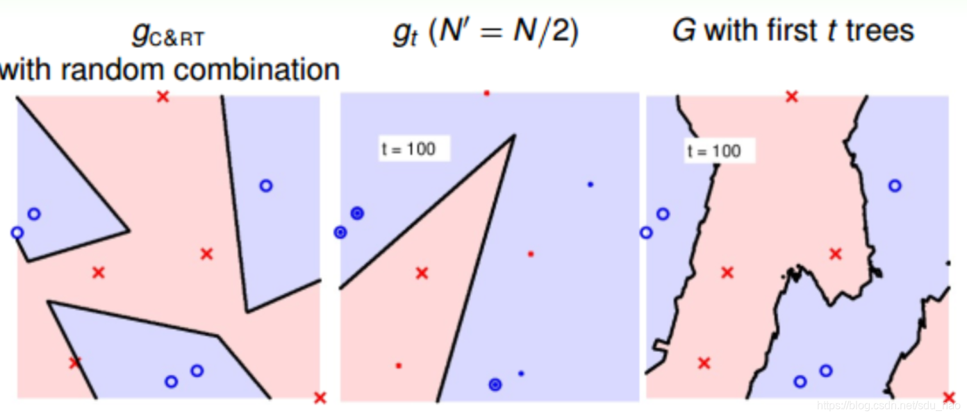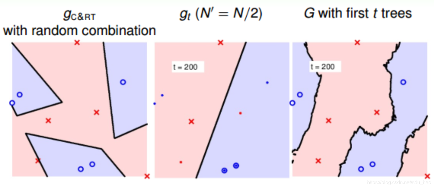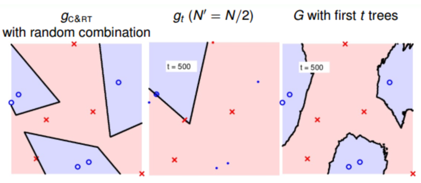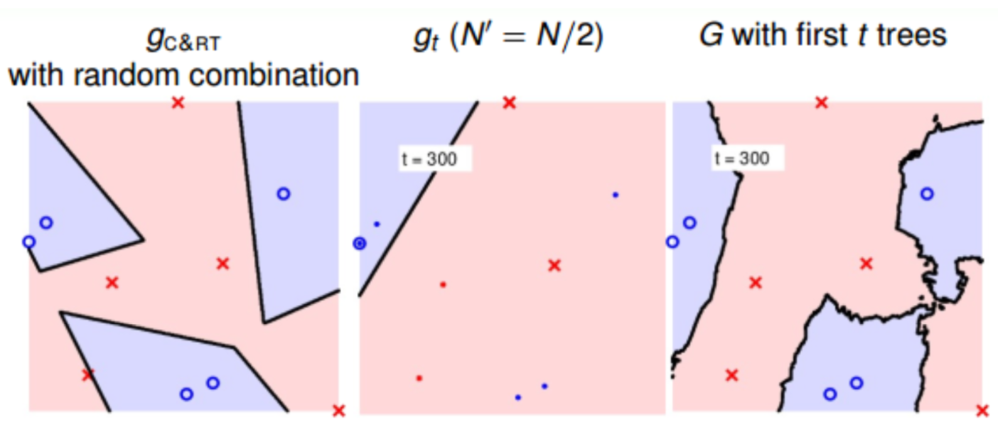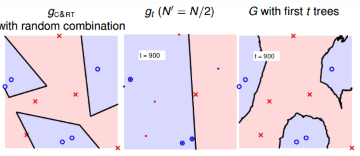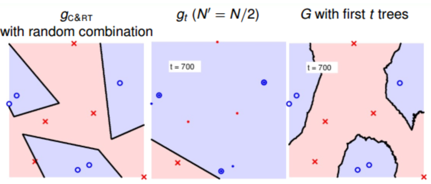 最后,我们通过实际的例子来看一下RF的特点。首先,仍然是一个二元分类的例子。 如下图所示,左边是一个C&RT树没有使用bootstrap得到的模型分类效果,其中不同特征之间进行了随机组合,所以有斜线作为分类线;中间是由bootstrap(N'=N/2)后 生成的一棵决策树组成的随机森林(只有第t棵树),图中加粗的点表示被bootstrap选中的点;右边是将前t棵决策树进行bagging后的分类模型。