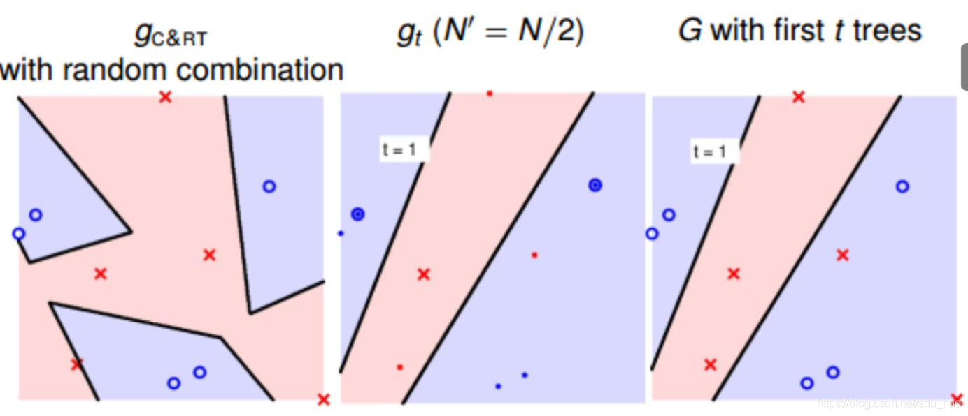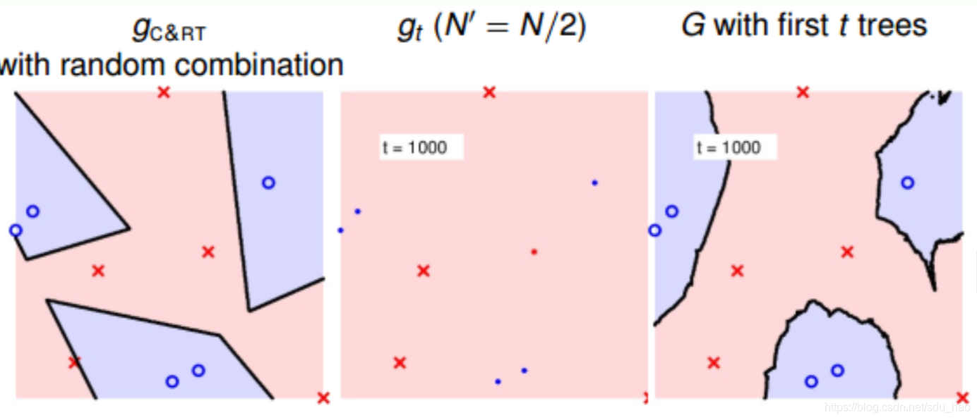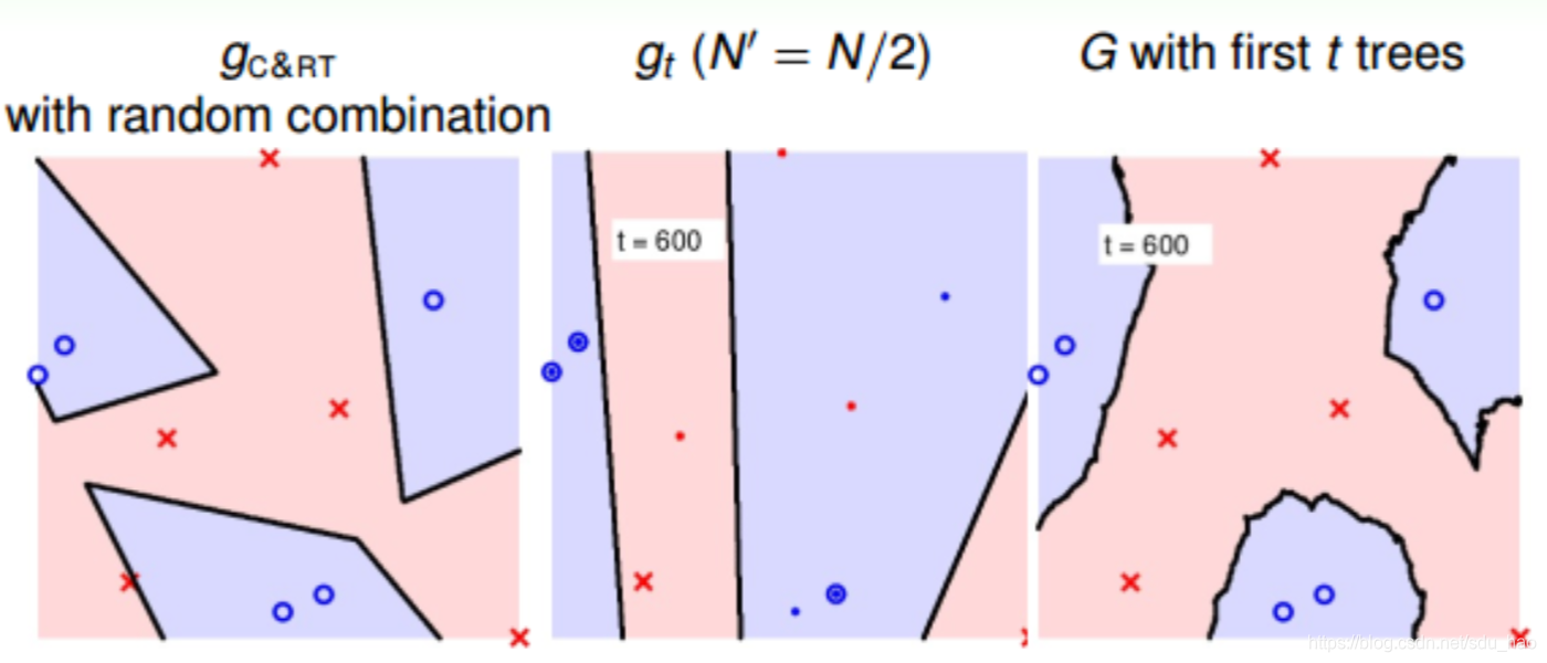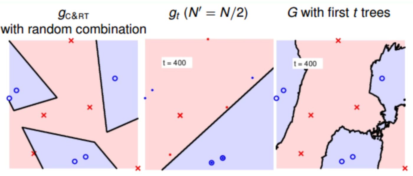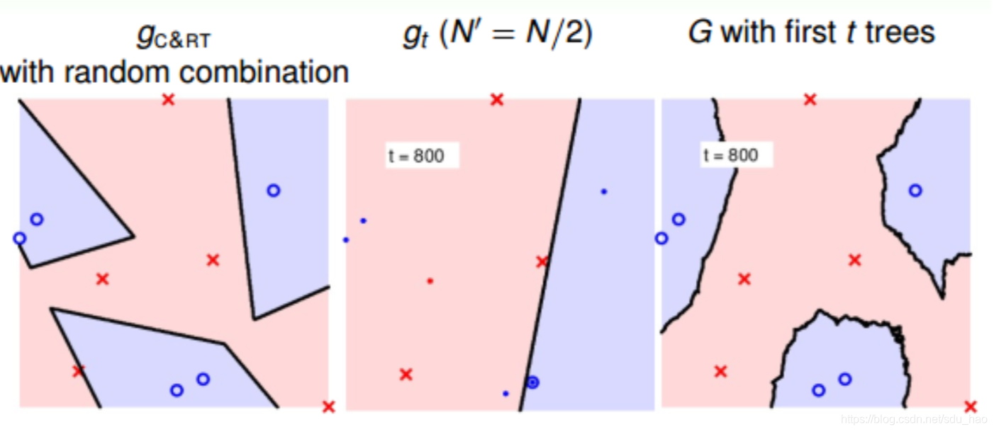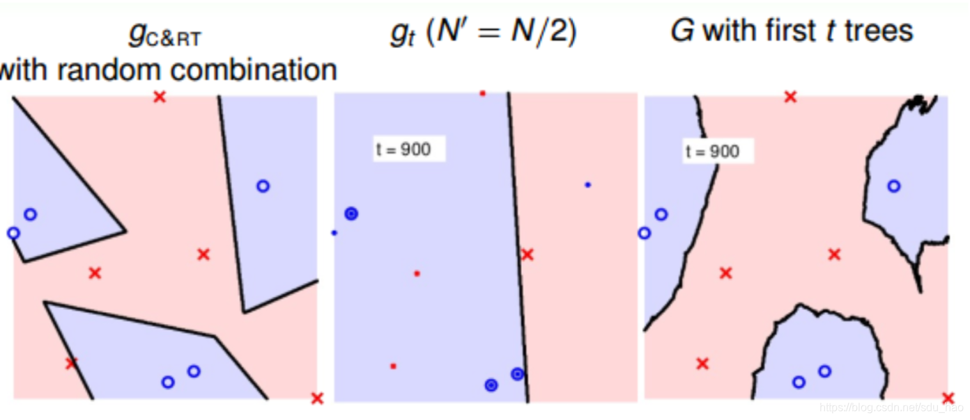 最后,我们通过实际的例子来看一下RF的特点。首先,仍然是一个二元分类的例子。 如下图所示,左边是一个C&RT树没有使用bootstrap得到的模型分类效果,其中不同特征之间进行了随机组合,所以有斜线作为分类线;中间是由bootstrap(N'=N/2)后 生成的一棵决策树组成的随机森林(只有第t棵树),图中加粗的点表示被bootstrap选中的点;右边是将前t棵决策树进行bagging后的分类模型。
