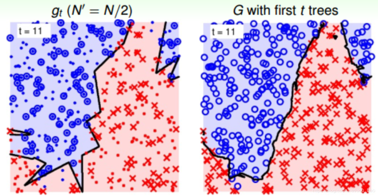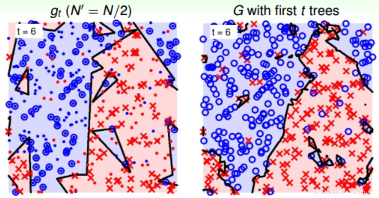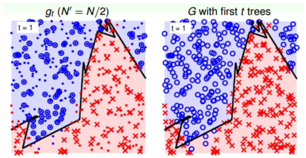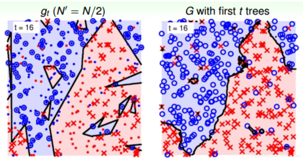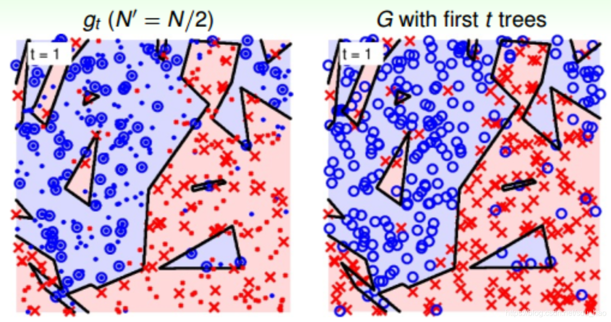 当t=100,即选择了100棵树时,中间的模型是第100棵决策树构成的,还是只有一棵 树;右边的模型是由100棵决策树bagging起来的,如下图所示: