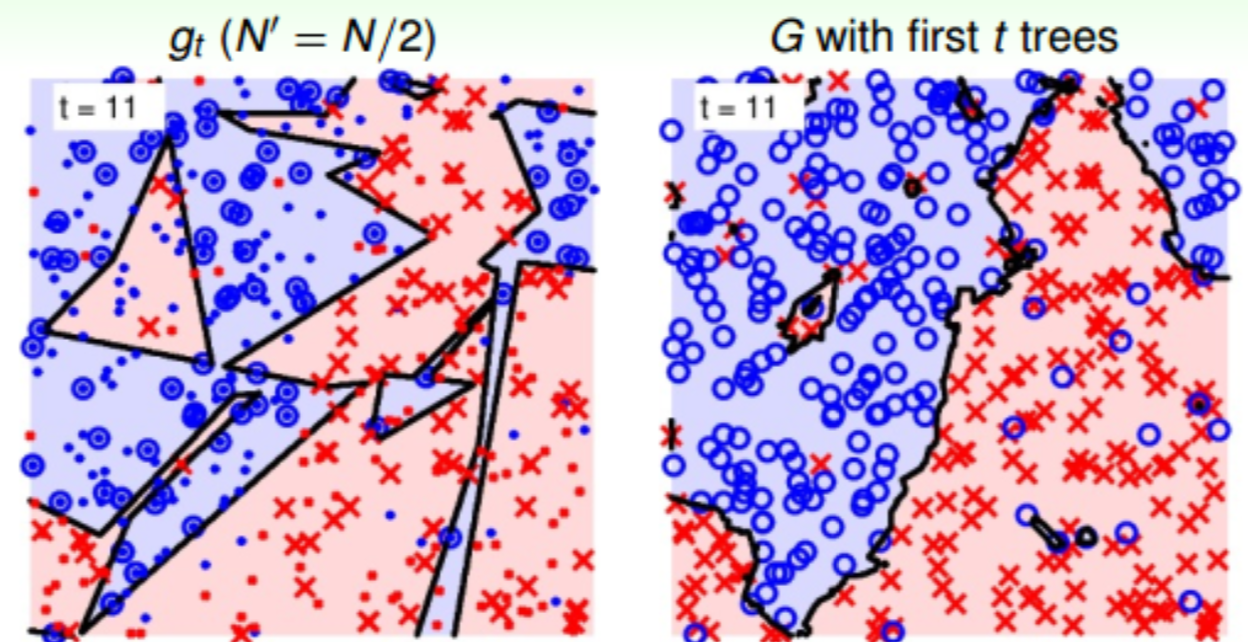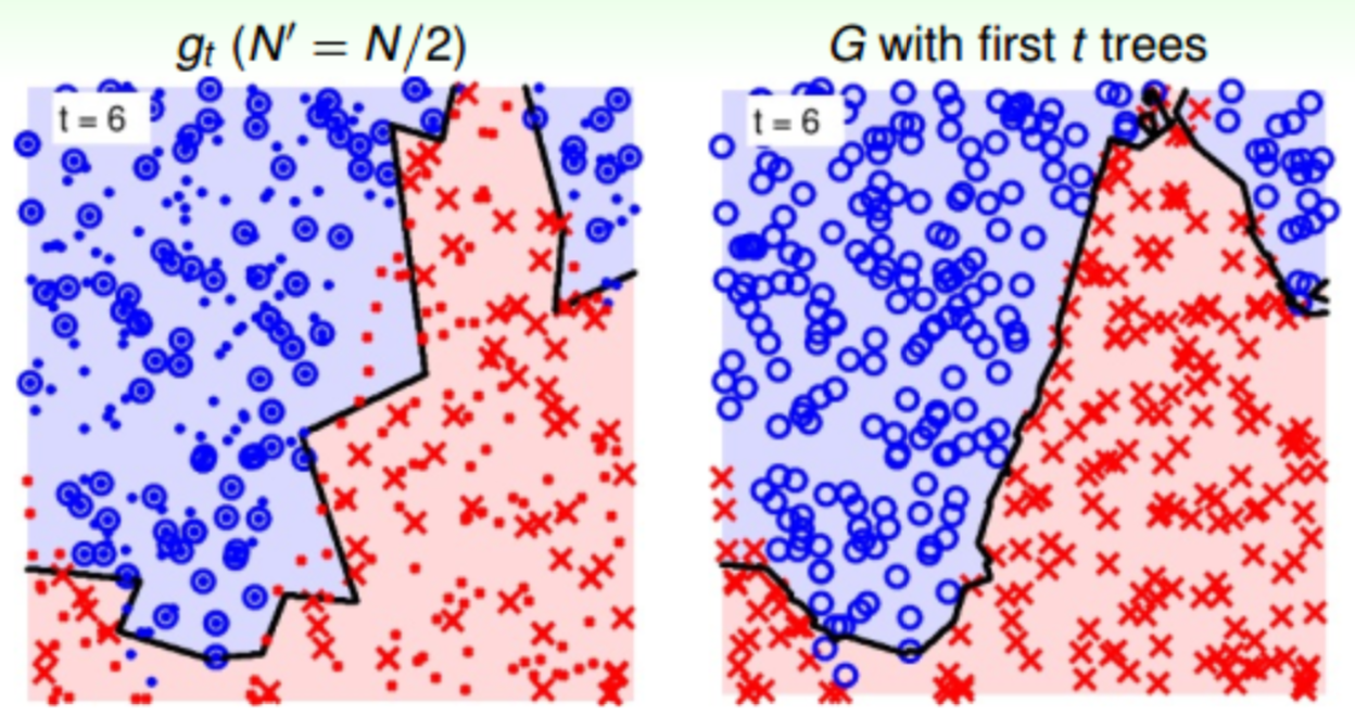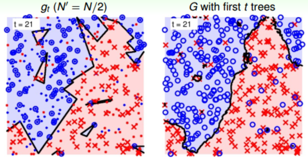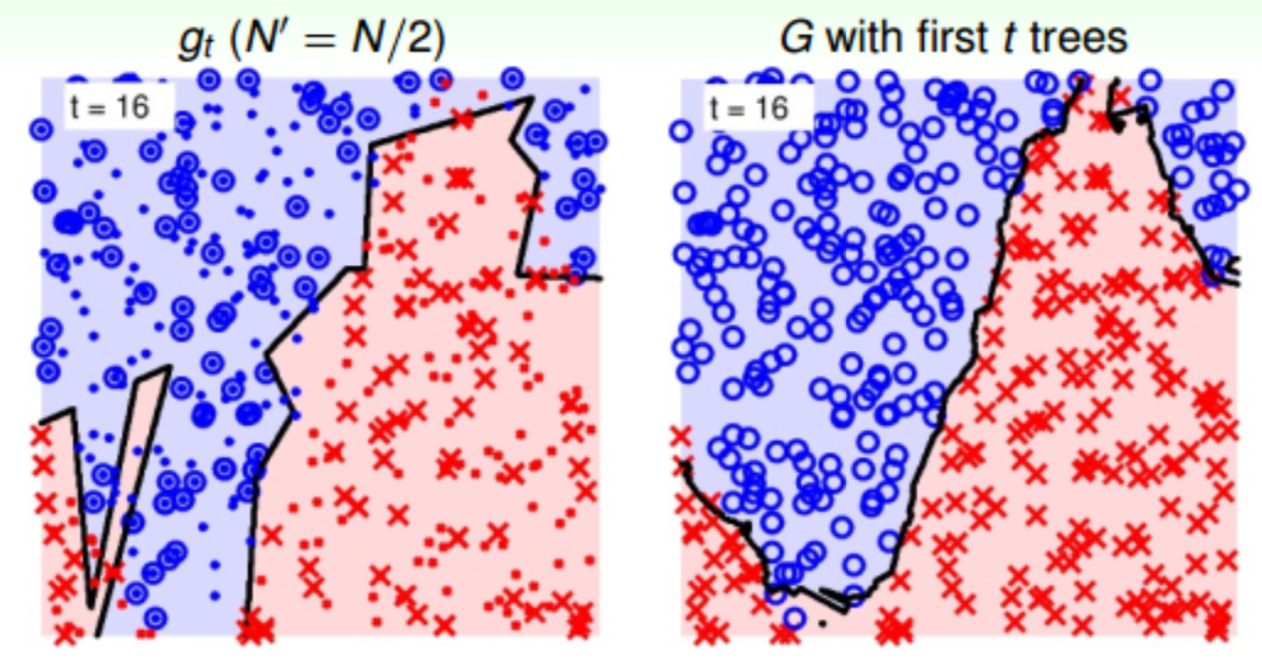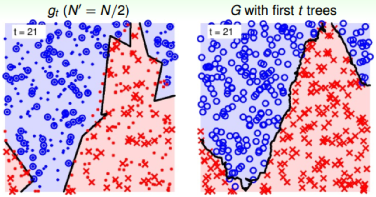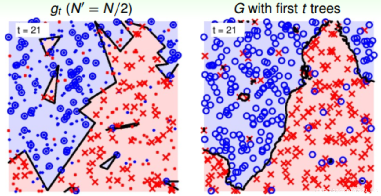 当t=100,即选择了100棵树时,中间的模型是第100棵决策树构成的,还是只有一棵 树;右边的模型是由100棵决策树bagging起来的,如下图所示: