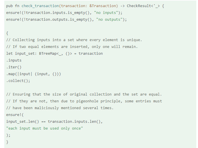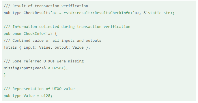 通过将数据组织为Rust枚举,可以防止意外误用,因为只有在交易有效时值才可用。反之亦然,只有在发现事务引用状态数据库中不存在的某个UTXO时,才可以使用缺少输入的列表。这样一来,就不会滥用API,这有利于提高可读性和链安全性。