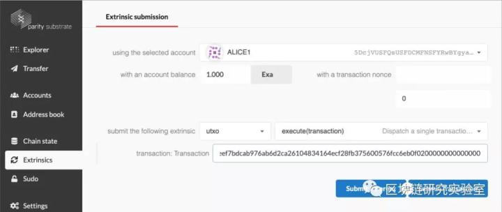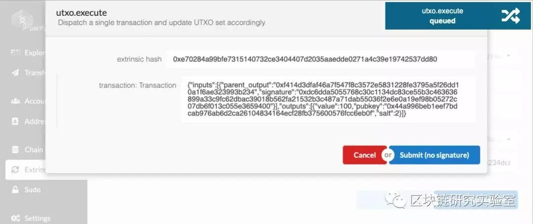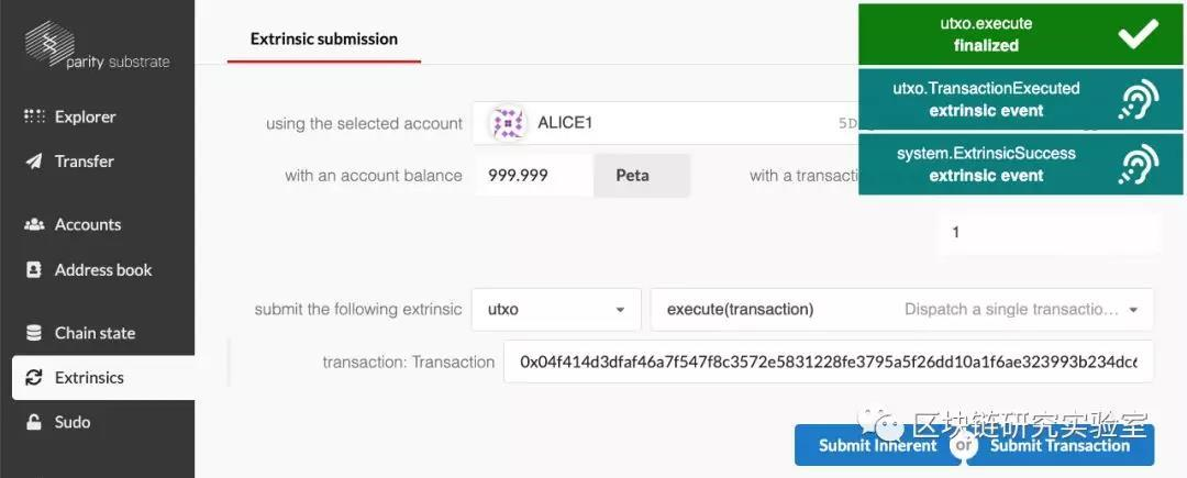 现在,让Alice花掉一部分价值,然后向Bob发送100个代币。我们通过UI提交Inherent的外部变量来做到这一点: