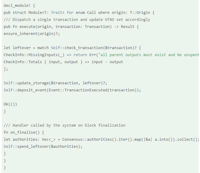 当阅读文章时,请记住我们的主要目标是评估Substrate的灵活性,而不是比特币移植时使用端口的详细解释。在某些情况下,其实现几乎与Parity比特币的实现相同,而在其他情况下则不是。例如当前的实现不支持挖掘和coinbase事务;它只是重新分配在genesis块中初始化的“预先定义”UTXO集的值。