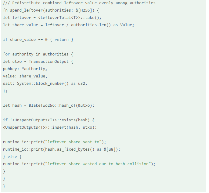逻辑非常简单:我们接受一个权限列表,然后将剩余的总值除以权限数平均得出一个share_value。然后,我们为每个作者创建一个UTXO,并将其插入UnspentOutputs中。我们将当前区块号用作salt值,以防止上述潜在的重放攻击。