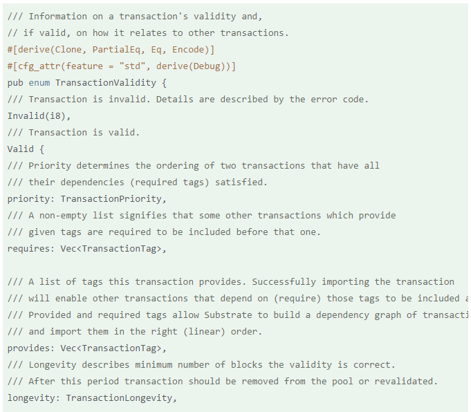 完成后,validate_transaction函数将产生TransactionValidity结构,该结构包含对事务池进行排序和优先考虑外部事务的提示: