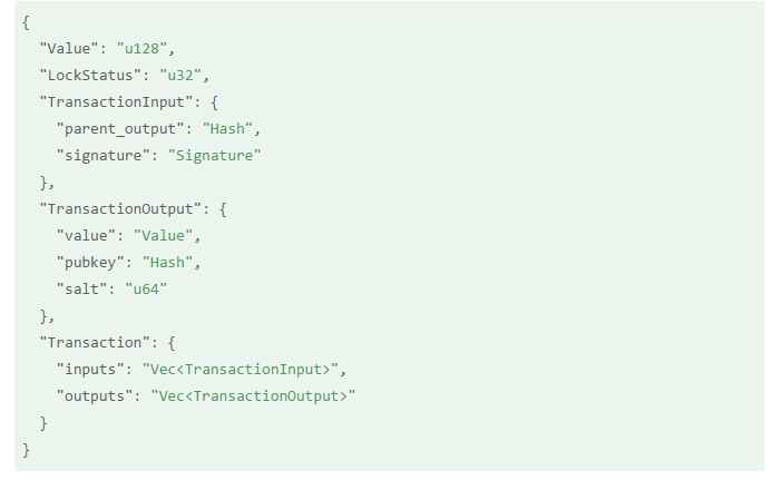 让我们从指定将用于定义UTXO链的业务逻辑的数据类型开始。首先是Transaction 类型。它表示要调度的单个UTXO事务: